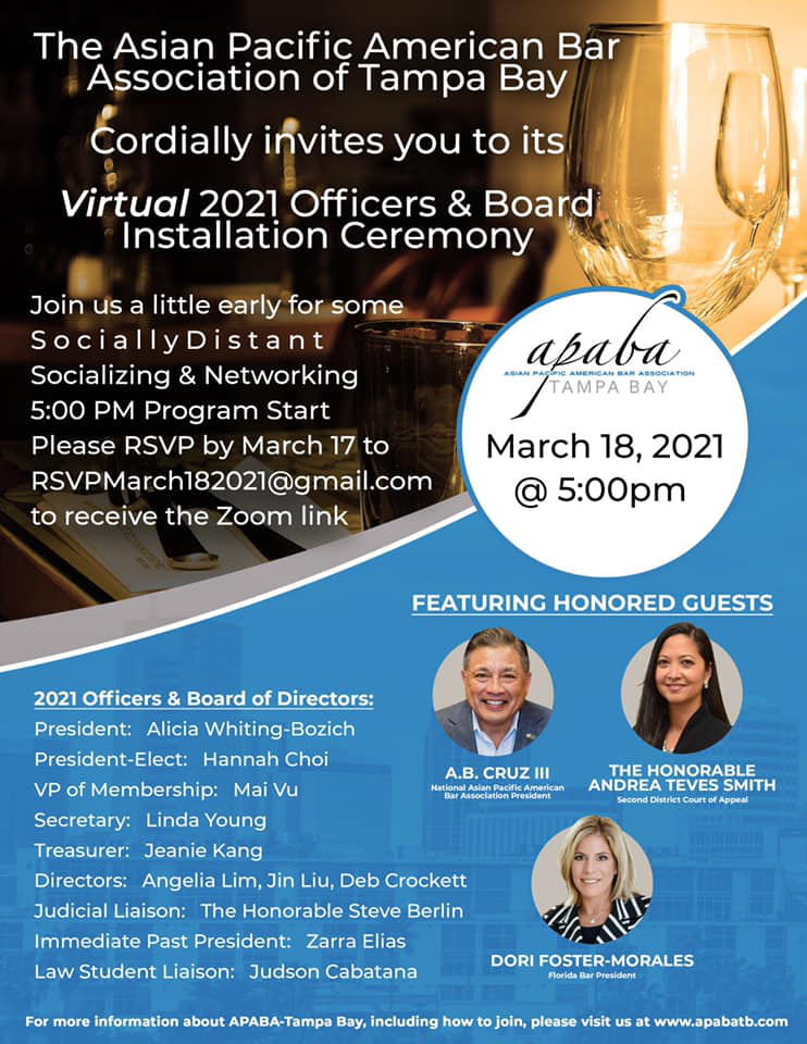 Please join us in celebrating APABA Tampa Bay’s Incoming President, Alicia Whiting-Bozich, at our Virtual 2021 Officer|Board Installation next Thursday, March 18, at 5 pm!