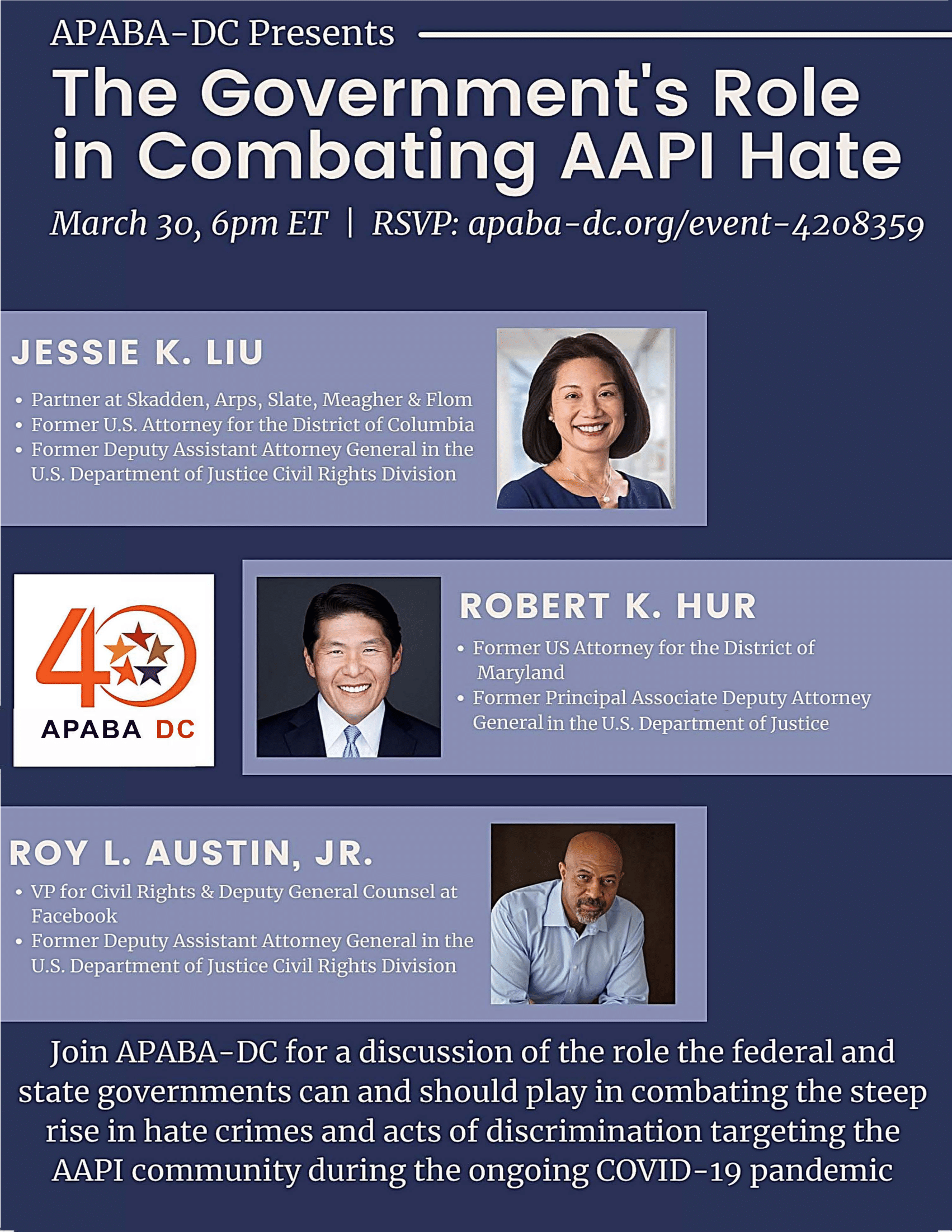 NAPABA is pleased to co-sponsor this webinar brought to you by APABA-DC. APABA-DC is deeply troubled by the steep rise in hate crimes and acts of discrimination targeting the AAPI community during the ongoing COVID-19 pandemic, especially the recent violent attacks against AAPI elders in Northern California and the horrific shooting of six AAPI women and others in Atlanta. Given that we live and work in the Nation’s Capitol, we have a keen interest in the role the federal government can and should play in combating such discrimination, the intersection between federal and state laws, and what we in DC can do to help. Please join us on Tuesday, March 30 at 6pm Eastern for an important and timely discussion with two esteemed former government officials. Panelists: Jessie K. Liu, Partner at Skadden, Arps, Slate, Meagher & Flom LLP, former U.S. Attorney for the District of Columbia, and a former Deputy Assistant Attorney General in the U.S. Department of Justice Civil Rights Division Robert K. Hur, former U.S. Attorney for the District of Maryland and former Principal Associate Deputy Attorney General in the U.S. Department of Justice