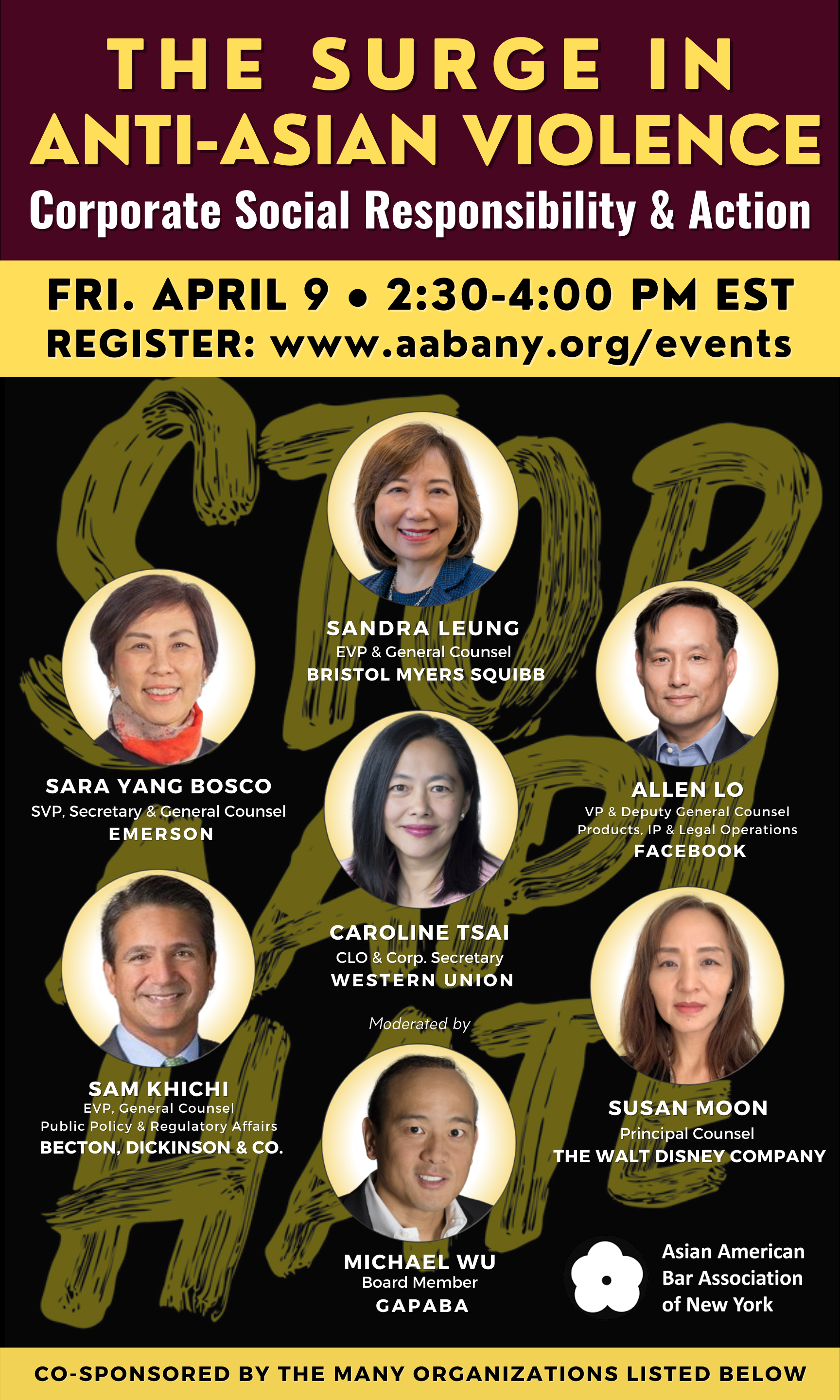 2020 saw a surge in anti-Asian violence. The AABANY and Paul Weiss report, “A Rising Tide of Hate and Violence Against Asian Americans in New York During COVID-19: Impact, Causes, Solutions” has been garnering widespread attention and acclaim. For a growing number of corporate employers, there is a keen desire to DO something. But what? What can or should corporate employers be doing to help stem and address anti-Asian violence and hate crimes? What could they be doing to support their Asian American and Pacific Islander employees? What do they need to understand about the difficulties of hate crimes prosecutions and the tensions between the valid concerns of those desiring aggressive prosecution, those who worry about further contributing to the prosecutions of people from other minority communities, and those who advocate for restorative justice? Please join AABANY and a coalition of bar associations for a discussion with corporate in-house leaders about corporate social responsibility and anti-Asian violence.