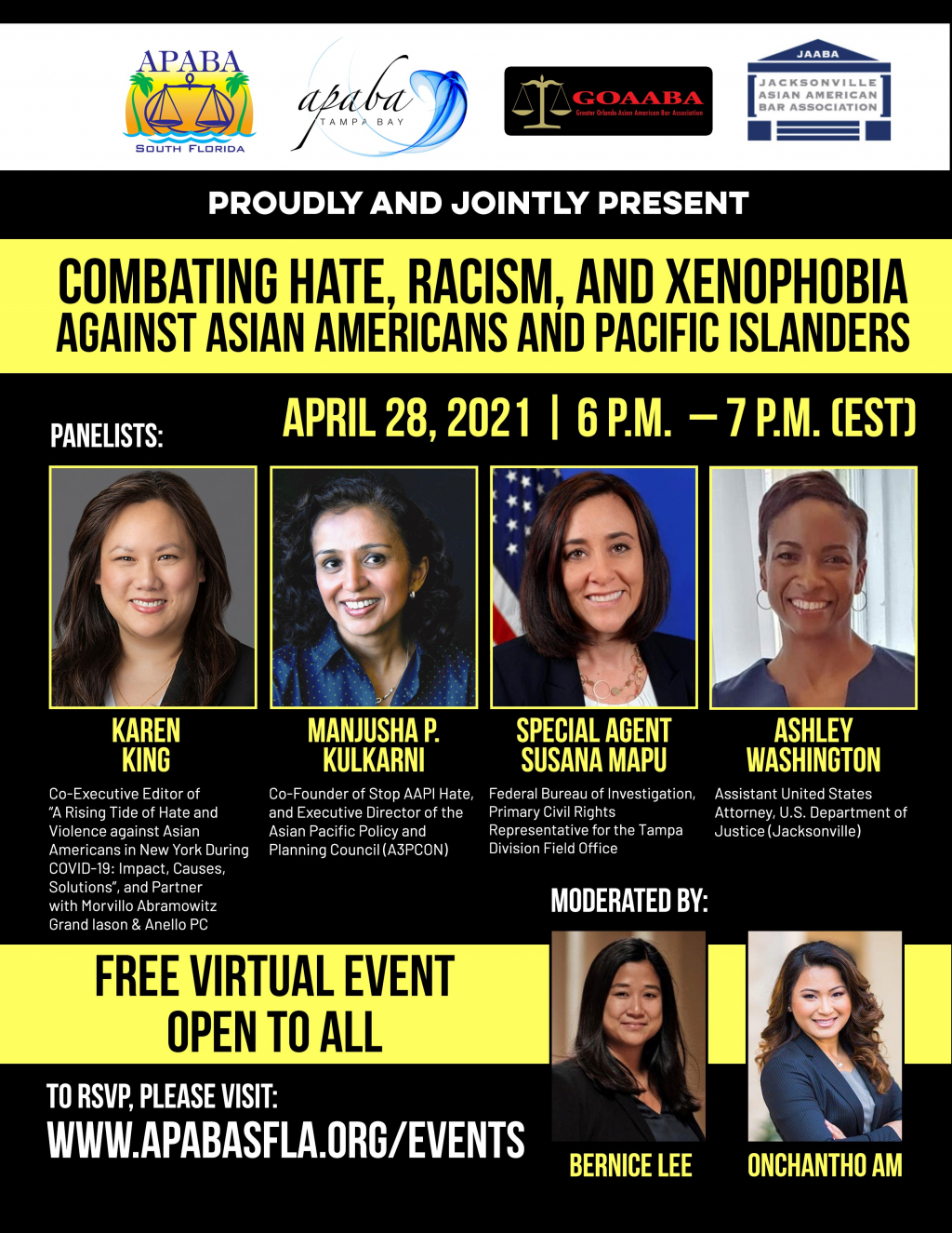 Join us for this very important panel discussion hosted by the Coalition of Florida APIA Affiliates with APABA South Florida, APABA of Tampa Bay, the Greater Orlando Asian American Bar Association, and the Jacksonville Asian American Bar Association. This event will be virtual and free to attend. Panelists: