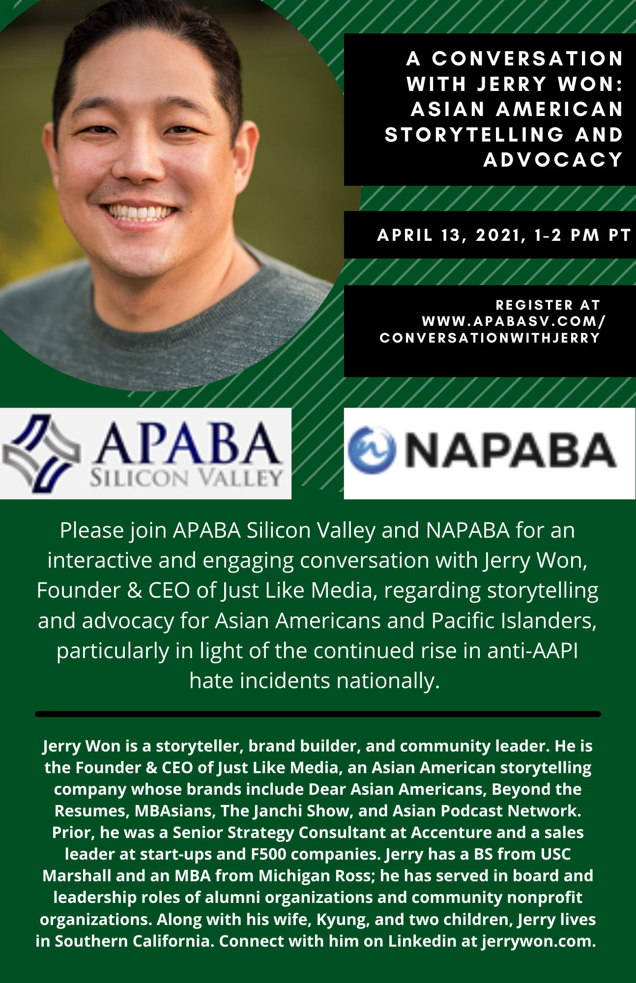 Please join APABA Silicon Valley and NAPABA for an interactive and engaging conversation with Jerry Won, Founder & CEO of Just Like Media, regarding storytelling and advocacy for Asian Americans and Pacific Islanders, particularly in light of the continued rise in anti-AAPI hate incidents nationally.
