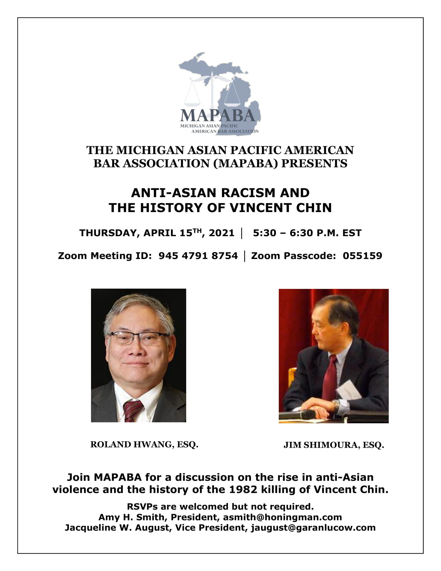Michigan Asian Pacific American Bar Association (MAPABA) is hosting a discussion event this Thursday, April 15th, 2021 from 5:30 - 6:30 p.m. via Zoom. Our speakers, Roland Hwang and Jim Shimoura, will be discussing the rise in anti-Asian violence and the history of the 1982 killing of Vincent Chin.
