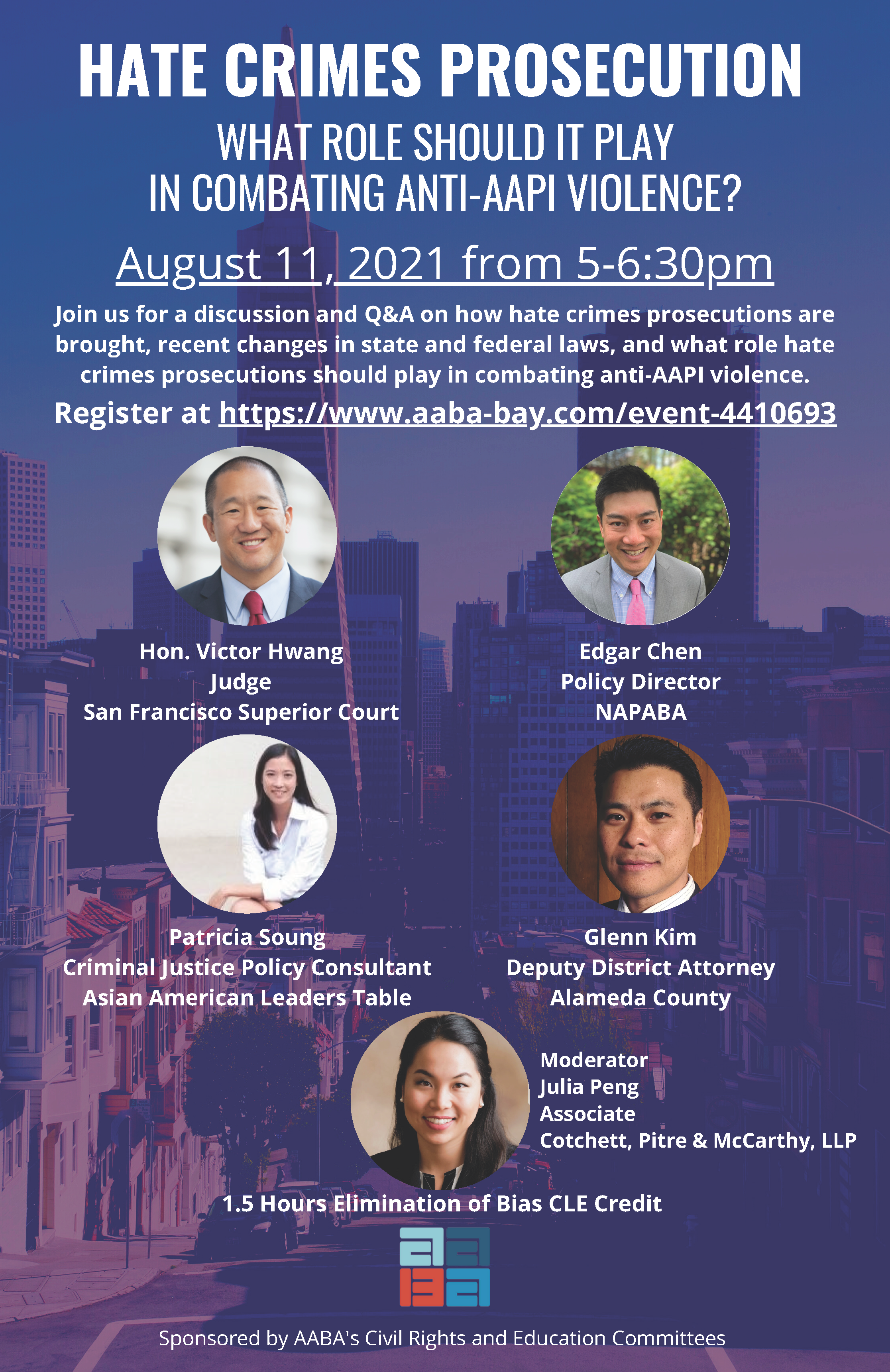 Join us for a discussion and Q&A on how hate crimes prosecutions are brought, recent changes in state and federal laws, and what role hate crimes prosecutions should play in combatting anti-AAPI violence. Register here: https://www.aaba-bay.com/event-4410693/Registration