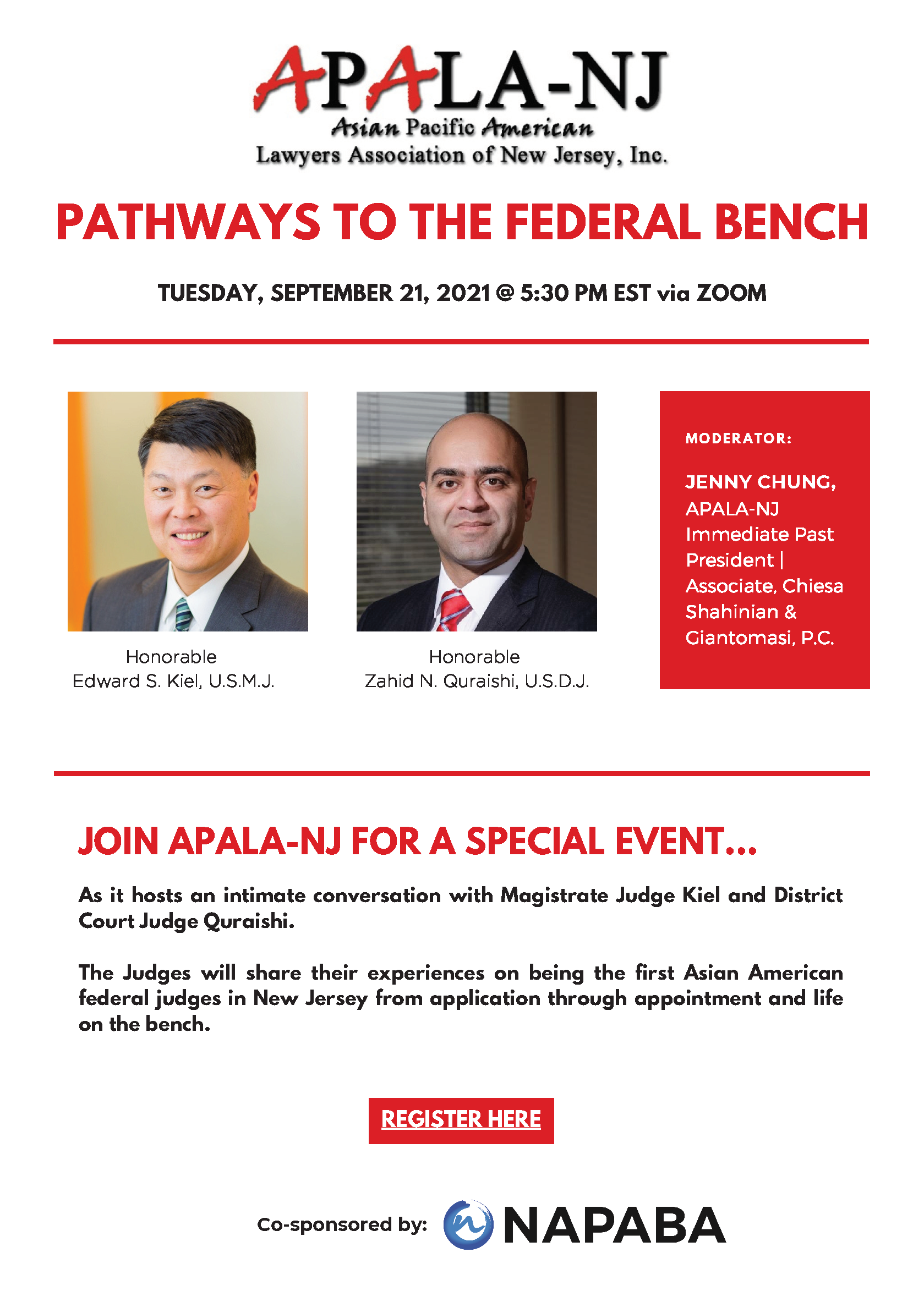 Join APALA-NJ for a Special Event as it hosts an intimate conversation with Magistrate Judge Kiel and District Court Judge Quraishi. The Judges will share their experiences on being the first Asian American federal judges in New Jersey from application through appointment and life on the bench.