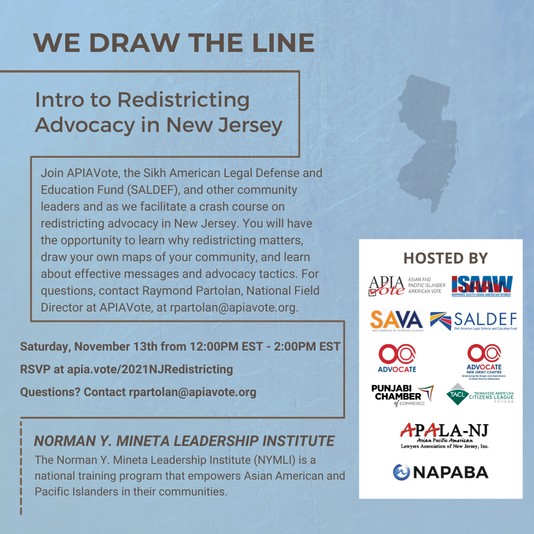 Description: Join APIAVote and the Sikh American Legal Defense and Education Fund (SALDEF) as we facilitate a crash course on redistricting advocacy in New Jersey. You will have the opportunity to learn why redistricting matters, draw your own maps of your community, and learn about effective messages and advocacy tactics. For questions, contact Raymond Partolan, National Field Director at APIAVote, at rpartolan@apiavote.org. This training is specifically geared towards members of the New Jersey AAPI community, but all are welcome to attend.