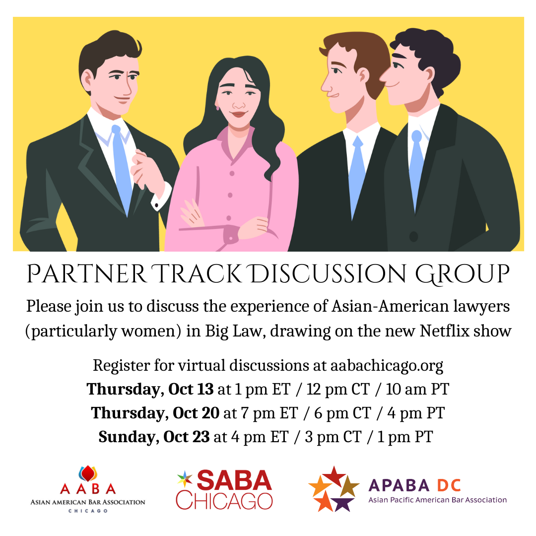 Please join the Asian American Bar Association of Greater Chicago (AABA Chicago), the South Asian Bar Association of Chicago (SABA Chicago), and the Asian Pacific American Bar Association of the Greater Washington, D.C. Area (APABA DC) to discuss the experience of Asian American lawyers (particularly women) in Big Law, drawing on the new Netflix show, Partner Track.